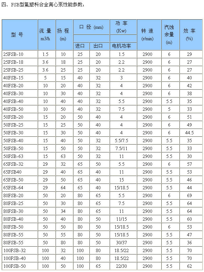FSB型氟塑料合金離心泵按國(guó)際標(biāo)準(zhǔn)設(shè)計(jì),泵體采用金屬外殼內(nèi)襯聚全氟乙丙烯(F46), 泵蓋、葉輪和軸套均用金屬嵌件外包氟塑料整體燒結(jié)壓制成型,軸封采用外裝式波紋管機(jī)械密封,靜環(huán)選用99%氧化鋁陶瓷或氮化硅,動(dòng)環(huán)采用四氟填充材料,耐腐耐磨,適用于輸送任何濃度的硫酸、鹽酸、醋酸、氫氟酸、硝酸、王水、強(qiáng)堿、強(qiáng)氧化劑、有機(jī)溶劑、還原劑等苛刻條件的強(qiáng)腐蝕性介質(zhì),是目前世界上最強(qiáng)耐腐蝕裝備之一。其具有結(jié)構(gòu)緊湊合理、耐強(qiáng)腐蝕、密封性能嚴(yán)密可靠、工作穩(wěn)定、噪聲低、機(jī)械強(qiáng)度高、不老化、無毒素分解、維修方便、流道光滑、效率高,節(jié)約能源等優(yōu)點(diǎn)。杜絕跑、冒、滴、漏, 應(yīng)用于化工、制酸、制堿、冶煉、稀土、農(nóng)藥、染料、醫(yī)藥、造紙、電鍍、電解、酸洗、無線電、化成箔、科研機(jī)構(gòu)、國(guó)防工業(yè)等行業(yè)。 二、技術(shù)參數(shù):