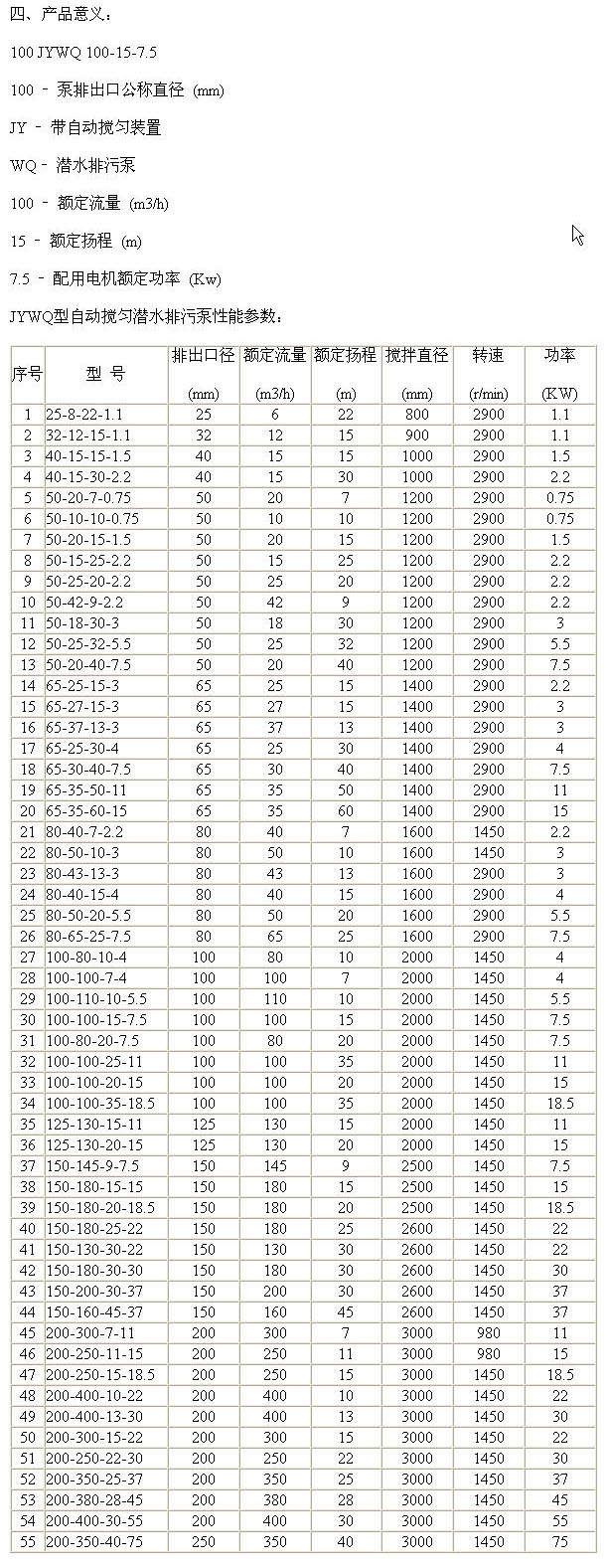 JYWQ型自動攪勻潛水排污泵是本司在吸收國外 技術的基礎上,采用優秀的水力模型開發研制而成的 環保類產品,在排送固體顆粒和長纖維垃圾以及減少污水坑內沉積等方面,具有獨特功能。 該泵水力性能 成熟,性能指標已達到或超過國外同類產品 技術水平。 二、適用范圍: 適用于化工、石油、制藥、采礦、造紙、電廠及城市污水處理、市政工程、公共設施排污等輸送帶顆粒、沉淀物的污水污物。