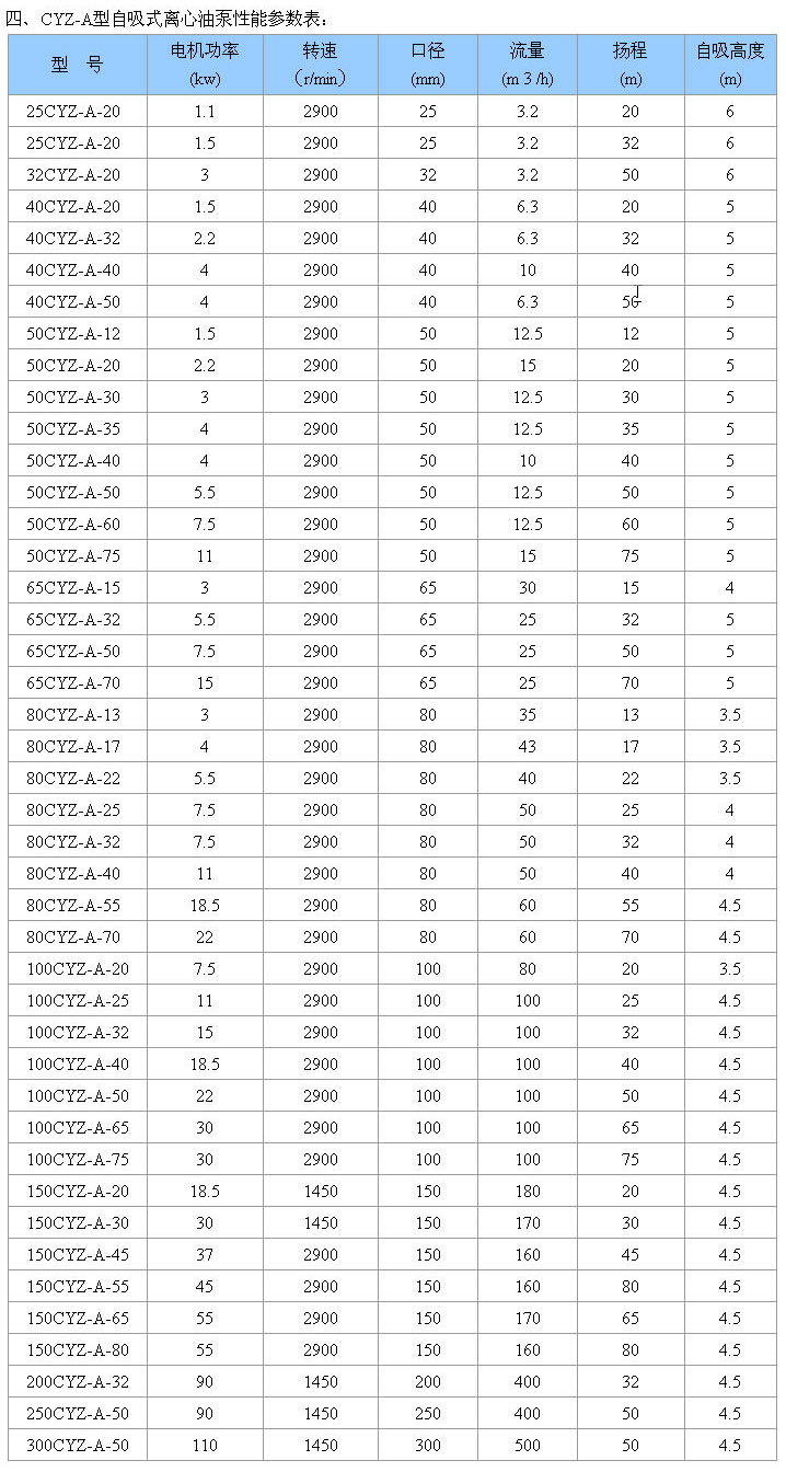CYZ-A型自吸式離心油泵![]() CYZ-A型自吸式離心油泵 更多信息一、產(chǎn)品概述: CYZ-A型自吸式離心油泵是根據(jù)國內(nèi)外有關(guān)技術(shù)資料經(jīng)消化、吸收、改進(jìn)后研制而成的最新泵類產(chǎn)品,該泵適用于石油行業(yè)、陸地油庫、油罐車的理想產(chǎn)品,并適合于作船用貨油泵、艙底泵、消防泵和壓載泵及機器冷卻水循環(huán)等,分別輸送汽油、煤油、柴油、航煤等石油產(chǎn)品和海水、清水,介質(zhì)溫度 二、產(chǎn)品特點: 1、該泵屬自吸式離心泵,它具有結(jié)構(gòu)簡單、操作方便、運行平穩(wěn)、維護(hù)容易、效率高、壽命長,具有較強的自吸能力等優(yōu)點。管路中不需底閥,工作前只需保證泵體內(nèi)儲有定量引油即可。用于油輪或輸水船舶上時,可兼作掃艙泵,掃艙效果良好, 2、該泵是選用 材料精制而成,密封采用硬質(zhì)合金機械密封,經(jīng)久耐用,吐出管路不需要安裝安全閥,吸入管路不需安裝底閥,因此簡化了管路系統(tǒng),又改善了勞動條件。 三、型號意義: