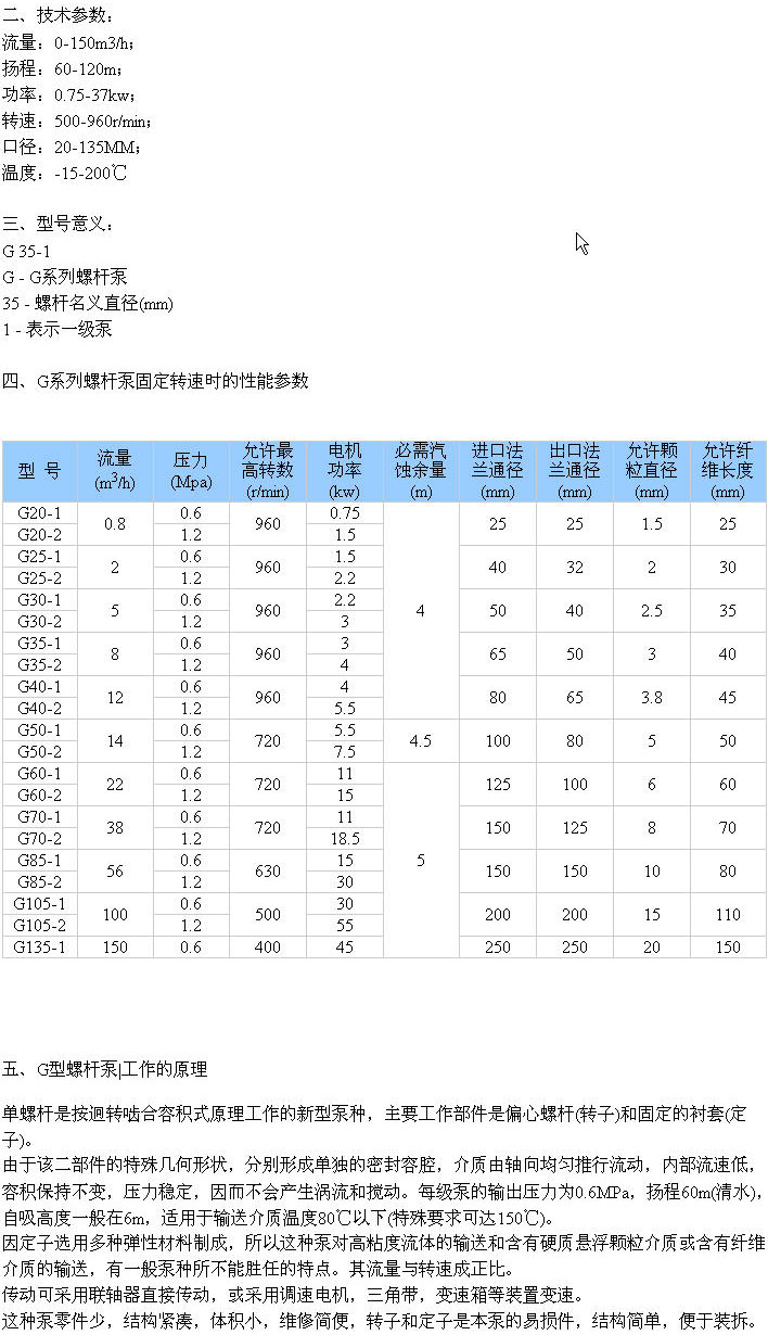 G型螺桿泵一、產品概述: 單螺桿是按迥轉嚙合容積式原理工作的 泵種,主要工作部件是偏心螺桿(轉子)和固定的襯套(定子)。 由于該二部件的特殊幾何形狀,分別形成單獨的密封容腔,介質由軸向均勻推行流動,內部流速低,容積保持不變,壓力穩定,因而不會產生渦流和攪動。每級泵的輸出壓力為0.6MPa,揚程 因定子選用多種彈性材料制成,所以這種泵對高粘度流體的輸送和含有硬質懸浮顆粒介質或含有纖維介質的輸送,有一般泵種所不能勝任的特點。其流量與轉速成正比。 傳動可采用聯軸器直接傳動,或采用調速電機,三角帶,變速箱等裝置變速。 這種泵零件少,結構緊湊,體積小,維修簡便,轉子和定子是本泵的易損件,結構簡單,便于裝拆。 | ||||||||||||||||