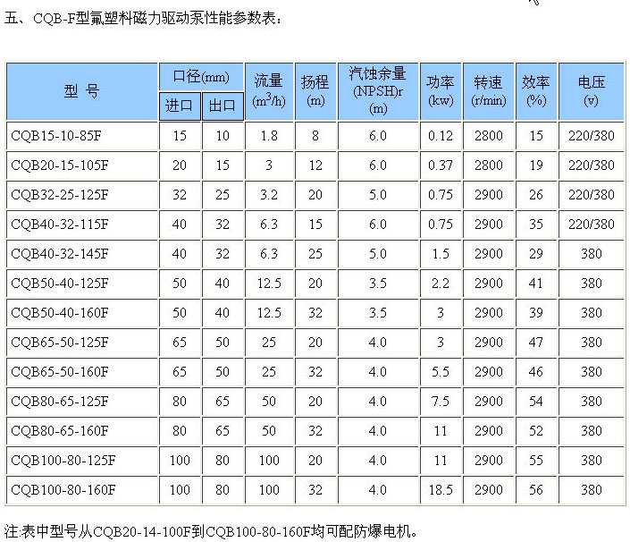 CQB-F型襯氟磁力泵一、產品特點: CQB-F型氟塑料磁力驅動泵防漏設計取消了軸封,利用磁力偶合間接驅動,完全消除了滴漏的煩惱,絕不污染使用場地。 由于泵的過流部分選用“氟塑料合金”制造。可連續輸送任意濃度的酸、堿、強氧化劑等腐蝕介質而毫不受損。 二、工作原理: 驅動裝置采用主動磁鐵聯軸器直接裝在電機軸上,泵室完全封閉,通過磁力偶合間接驅動泵軸上帶磁鐵的葉輪旋轉結構緊湊、安全節能。 堅固耐用的泵體結構雖然接觸液體部分是氟塑料,但泵外殼是金屬材料,故泵體足以承受管道的重量及抵受機械性沖擊。 三、主要用途: 本產品 適用于:石油化工、制酸制堿、有色金屬冶煉、汽車制造的酸洗工藝、稀土分離、農藥、染料、醫藥、造紙、電鍍、無線電等行業。 使用溫度: 四、型號意義: