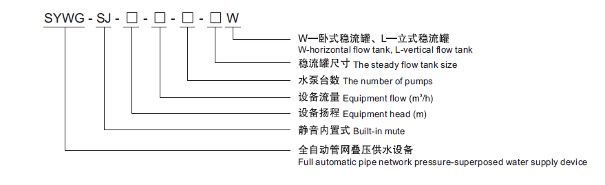 SYWG-SJ內(nèi)置水泵管網(wǎng)疊壓供水設(shè)備,由不銹鋼潛水泵(一般一臺(tái)至2臺(tái)),穩(wěn)流罐1個(gè),罐上設(shè)有壓力傳感器、真空抑制器,不銹鋼止回閥、不銹鋼蝶閥(或球閥)、氣壓穩(wěn)壓罐、不銹鋼管路、變頻控制柜。