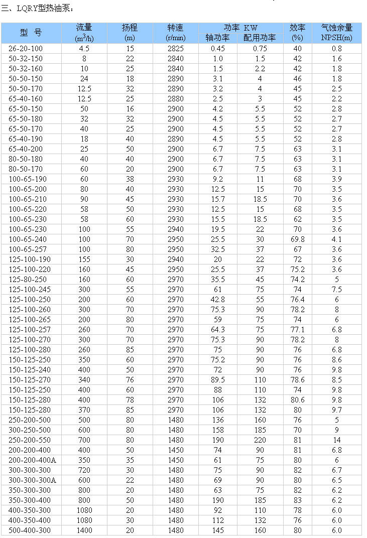 LQRY系列熱油泵,在我國載熱體加熱系統中得到 的使用,已經進入石油、化工、橡膠、塑料、制藥、紡織、印染、筑路、食品等各個工業領域,主要用于輸送不含固體顆粒的弱腐性高溫液體,使用溫度≤ 二、型號說明: