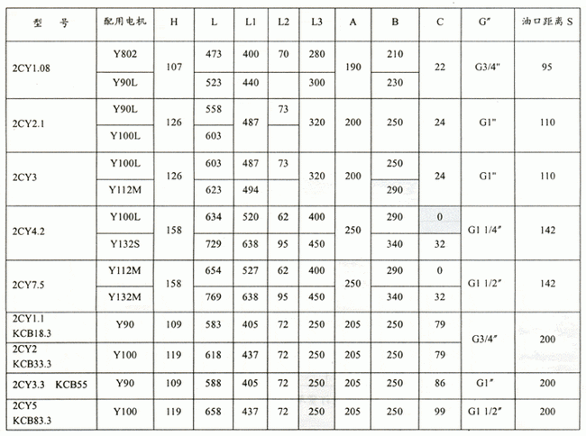 ![]() 2CY、KCB齒輪式輸油泵外形安裝尺寸表:
