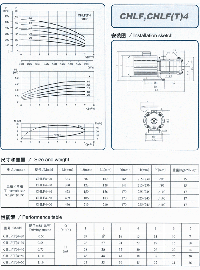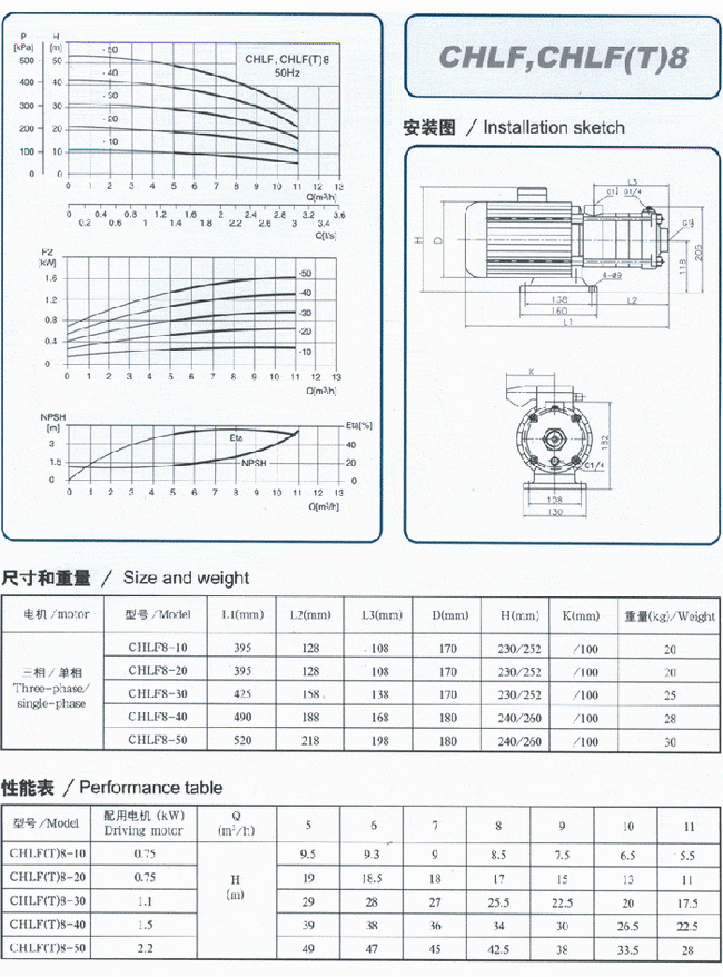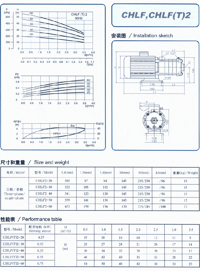 CHLF(T)輕型段式多級離心泵性能參數表![]() ![]() ![]()